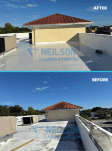 Take a look at this impressive before-and-after from one of our recent commercial projects here at Neilson Cleaning & Painting. This rooftop had accumulated years of dirt, heavy staining, and weather-related buildup. Using our professional, commercial-grade cleaning process, our team was able to safely restore the surface—bringing back a cleaner, brighter, and refreshed appearance without causing damage to the structure.